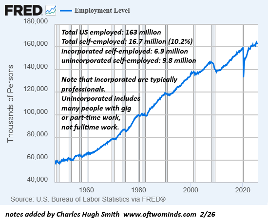 This guest essay by longtime correspondent 0bserver describes the core dynamics of work in America and the global economy: if we don't own our work, we only "rent" our income and the life it funds. I discuss the process of owning your work in my book Get A Job, Build a Real Career and Defy a Bewildering Economy. The system doesn't make it easy to own your work, and this isn't accidental.