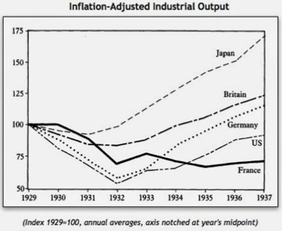 In some chronologies the chart reflects the order in which the countries went off gold, with Japan first, then Britain, Germany, U.S., and finally France. In Germany and the U.S., industrial output experienced a significant rebound from 1932 to 1933. But the U.S. didn't "go off gold" until almost mid-1933, yet industrial output was already rising. Then it mostly flattened before rising when the dollar was again tied to gold.