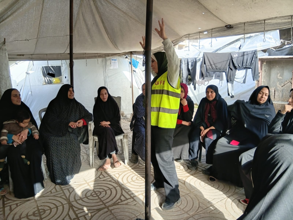 Cette séance au camp d'Al-Katiba s'inscrit dans la continuité d'un travail soutenu mené par l'équipe de l'UJFP dans différentes régions de la bande de Gaza, allant de la protection de l'enfance à Deir al-Balah à l'autonomisation des femmes au cœur de la ville, dans le cadre de la construction d'un système de protection intégré qui place l'être humain au centre de l'attention et renforce la conscience, la dignité et la résilience communautaire. Les femmes de Gaza affirment que, malgré la douleur, elles sont toujours capables de parler, de rêver et de créer l'espoir au cœur de la souffrance. »