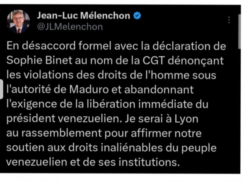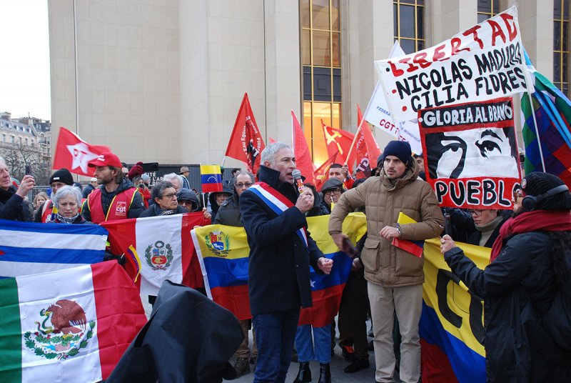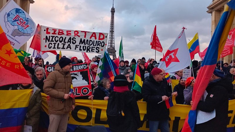 Une manifestation organisée le 10 janvier à Paris, au Trocadéro, par le Collectif international pour la paix au Venezuela - 36 organisations solidaires latino-américaines et africaines [26] - est boycottée par les notables « anti-impérialistes » et la « contra » [27] françaises. Au cours d'une réunion convoquée par l'intersyndicale, à laquelle participe entre autres France Amérique latine, il est décidé que la CGT, sous l'autorité de sa secrétaire générale Sophie Binet, appellera à un rassemblement « unitaire » parallèle, à la même heure, à La Bastille, pour dénoncer l'intervention américaine, mais sans réclamer la libération du président vénézuélien.