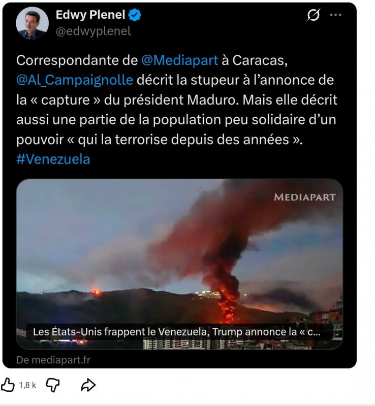 Les fabricants de foutaises entrent en action. Dans la matinale de France Inter, Eric Biegala (service international de Radio France) reprend à son compte le script rédigé par le State Department depuis 2020 : « C'est presque plus une opération de police qu'une opération de guerre [...]. Le président américain précise même que l'opération a été faite en conjonction avec les forces de l'ordre, donc il s'agit bien d'une arrestation. » Deux jours plus tard, sur France Info, Agathe Lambret, ajoute son ignorance guillerette au moulin des approximations : « Cette opération rappelle aussi celle au Panamá en 1989, autre scénario rocambolesque, mais des centaines de morts à l'époque, alors que cette fois, zéro mort ! »