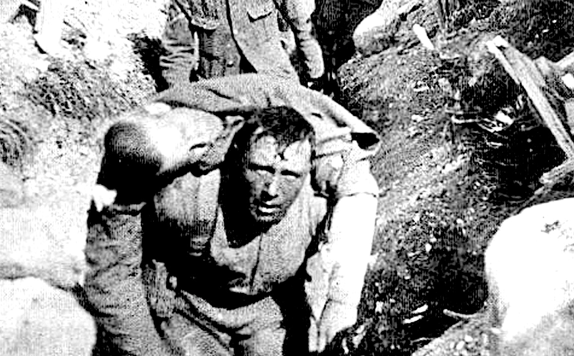 Soldat britannique blessé porté à travers une tranchée dans le documentaire et film de propagande de guerre de la Première Guerre mondiale, Bataille de la Somme, 1916. (Wikimedia Commons)