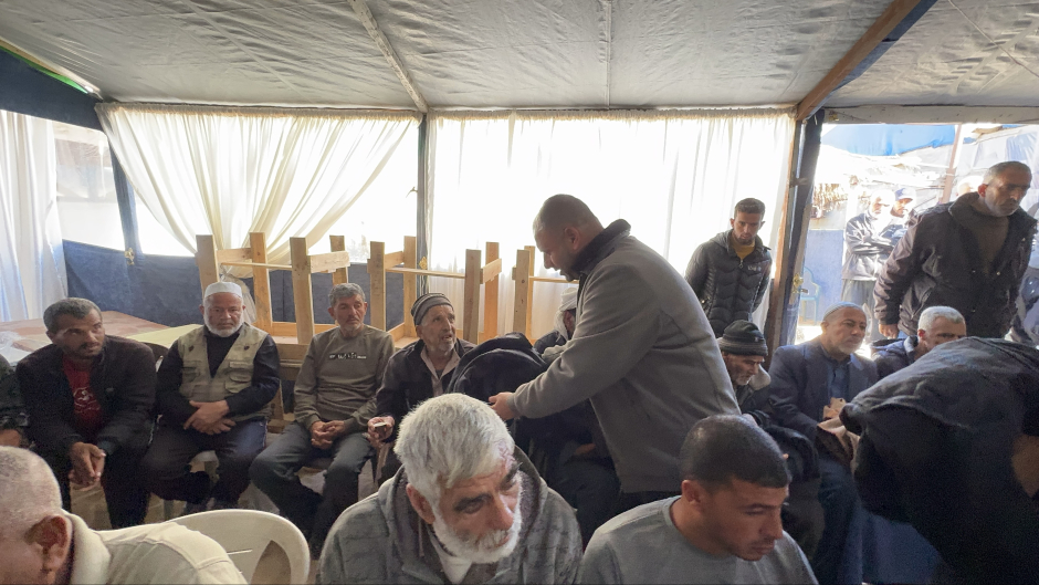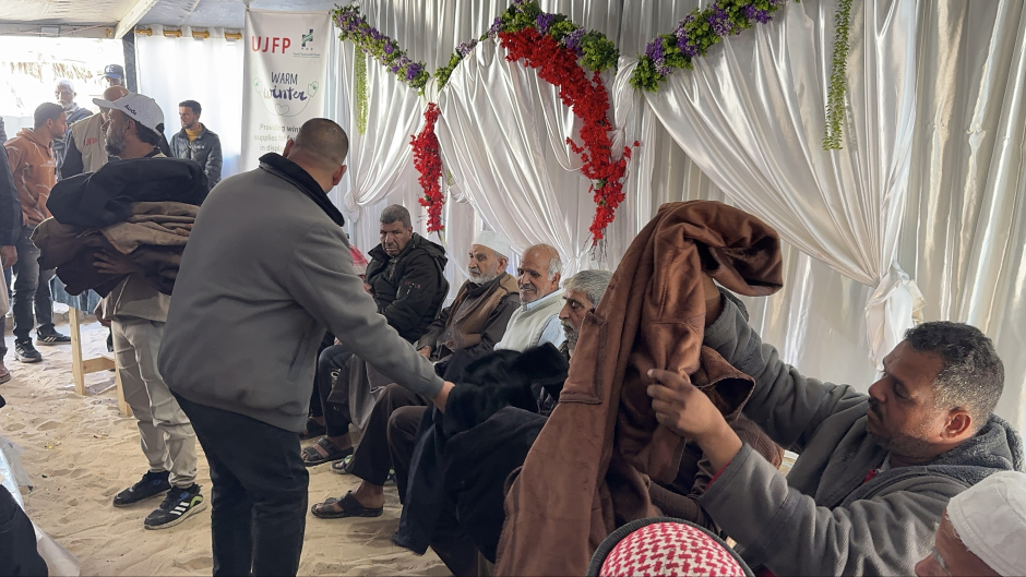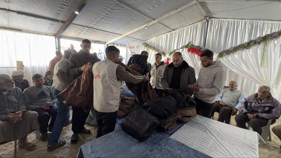 Lors de cette rencontre, l'objectif était clair dès le premier instant : écouter sincèrement les problèmes des agriculteurs déplacés dans les camps de déplacement de la zone de Mawassi à Khan Younès, et offrir à leurs aînés un peu de chaleur grâce à la distribution de manteaux d'hiver, atténuer la dureté de l'hiver et celle de la vie en même temps. Quant au contexte de l'initiative, il s'est formé à partir d'appels lancés par les agriculteurs âgés eux-mêmes, lorsqu'ils ont demandé aux équipes de l'UJFP travaillant dans leurs camps d'organiser une rencontre qui les réunirait, écouterait leur voix, examinerait leurs problèmes accumulés et chercherait des solutions, dans les limites du possible. De là est née l'idée de l'initiative, pour fournir des manteaux d'hiver afin de les protéger du froid, mais aussi pour affirmer que ces agriculteurs restent une partie intégrante de la société et qu'ils ont droit à la chaleur et à la dignité, au même titre que les autres catégories ayant bénéficié de cette initiative humanitaire.
