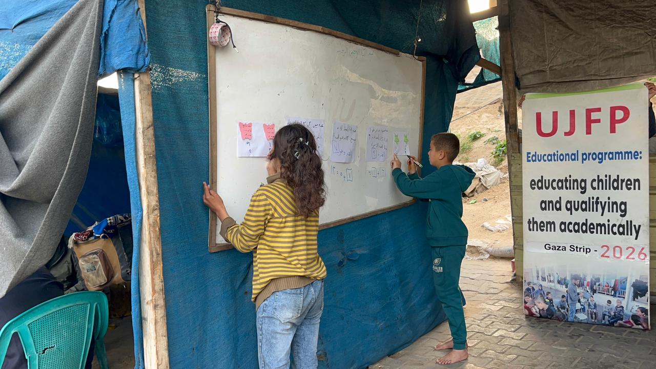 « À Gaza, l'interruption de l'éducation n'est plus un risque futur, mais une réalité quotidienne qui menace toute une génération. Avec la destruction des écoles et la transformation de nombreuses d'entre elles en centres d'hébergement, les enfants sont privés de la routine éducative qui représente un élément essentiel d'équilibre dans leur vie. Face à ce défi, l'UJFP a contribué à la création d'espaces éducatifs alternatifs au sein des camps et des zones de déplacement, afin d'assurer un enseignement de base, un accompagnement pédagogique et des activités éducatives interactives. Offrir aux enfants la possibilité d'être des élèves plutôt que de simples survivants.