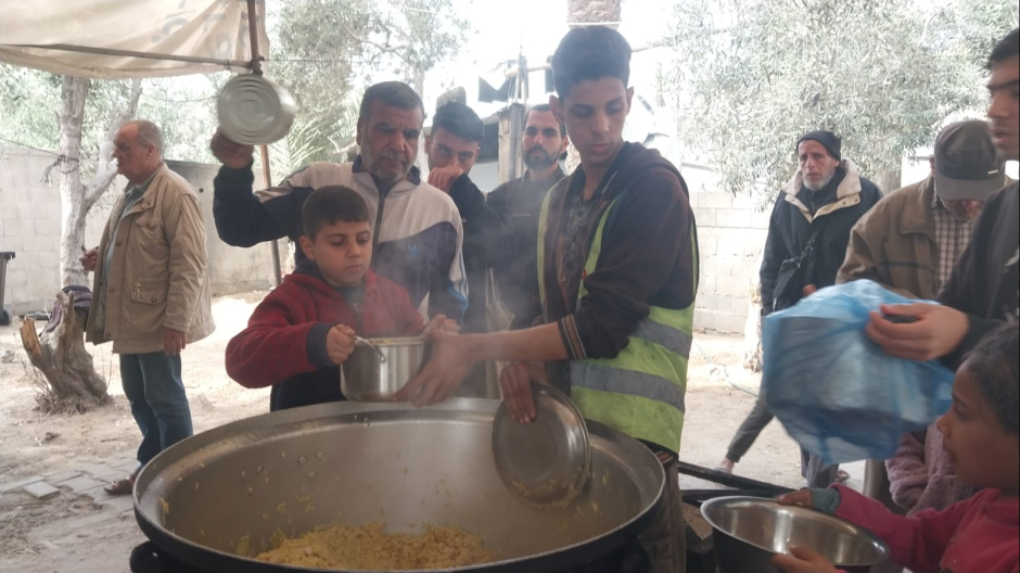 Les enfants ne demandent pas tant ce qu'il y a dans la marmite que"s'il y en aura assez". Une question simple, mais qui révèle une conscience précoce de la dureté de la réalité et du fait que la nourriture n'est plus acquise. Dans ces espaces surpeuplés, la nourriture préparée par les équipes devient un outil collectif d'apaisement. Le repas ne se contente pas de calmer la faim : il atténue la tension, redonne un minimum de structure à une journée privée de tout ordre. C'est un moment bref, mais qui procure à la famille un sentiment temporaire de sécurité et repousse l'effondrement, ne serait-ce que de quelques heures. Parallèlement, à une courte distance géographique les mêmes équipes travaillent à Deir Al-Balah, cuisinant et préparant des repas pour les familles déplacées de la ville de Gaza et du nord de la bande. Là-bas, les familles se tiennent dans des files silencieuses, non pas parce que le besoin est moindre, mais parce que l'épuisement est plus profond. Chaque repas distribué représente un jour de survie supplémentaire, une réduction de la tension et une protection des enfants contre la malnutrition dans un environnement dépourvu d'alternatives.