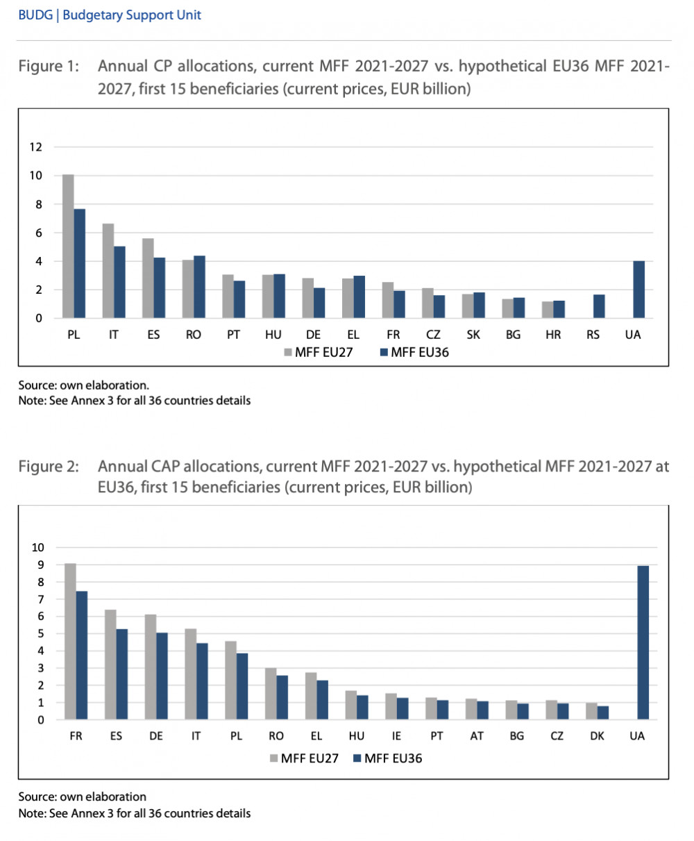 On sait ainsi que l'intégration de l'Ukraine, qui est prévue pour 2030, va bouleverser la Politique agricole commune (la PAC), puisque celle-ci consiste principalement à distribuer des aides financières aux agriculteurs en fonction de leur surface. Jusqu'à présent, la France, compte tenu de ses surfaces, était la première bénéficiaire de la PAC (et de loin). Selon un rapport commandé par le Parlement européen à l'Institut Jacques Delors, les choses changeraient substantiellement avec l'Ukraine qui prendrait la place de premier bénéficiaire. En appliquant les règles actuelles de paiement direct par hectare, l'Ukraine percevrait environ 7,8 à 9,3 milliards d'euros par an, un montant comparable à l'enveloppe française. La France, bien que moins touchée que l'Espagne ou l'Italie, verrait ses enveloppes pour l'agriculture et l'environnement réduites de près de 2 milliards d'euros, soit une baisse d'environ 18 %.