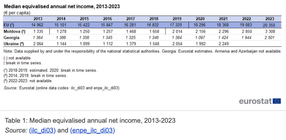 Avec la Moldavie et l'Ukraine, l'écart est encore pire : un revenu médian annuel de 3 308 € (par personne) pour la Moldavie pour l'année 2023 et de 2 249 € pour l'Ukraine en 2021 (dernières données disponibles). À titre de comparaison, le revenu médian annuel en Chine (par personne) était d'environ 4 450 € en 2024 selon le bureau national des statistiques chinois.