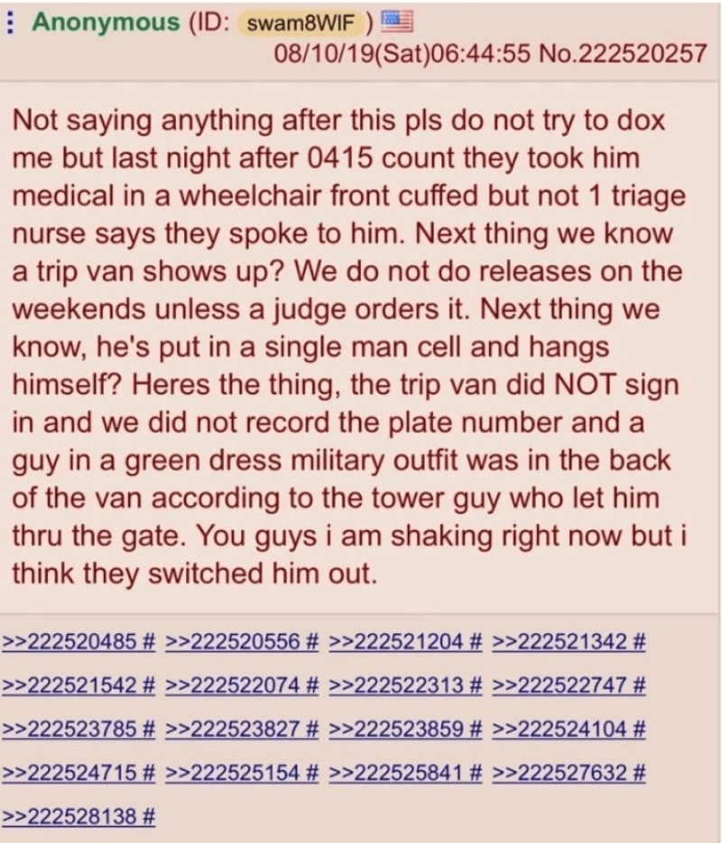 L'hypothèse qu'Epstein soit encore en vie n'est pas à exclure. Un employé de la prison, Roberto Grijalva, a en effet déclaré que, dans la nuit du "décès" d'Epstein, celui-ci aurait été emmené en fauteuil roulant et chargé dans une camionnette. C'est du moins ce qu'a rapporté Jimmy Dore dans son émission .