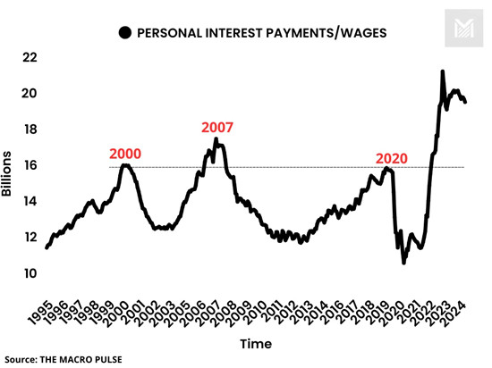 As debt becomes the norm to afford a middle-class quality of life, an increasing share of wages is devoted to debt service/interest. Recall that every student loan and mortgage is a debt to the borrower but an income-producing asset to the owner of the loan.