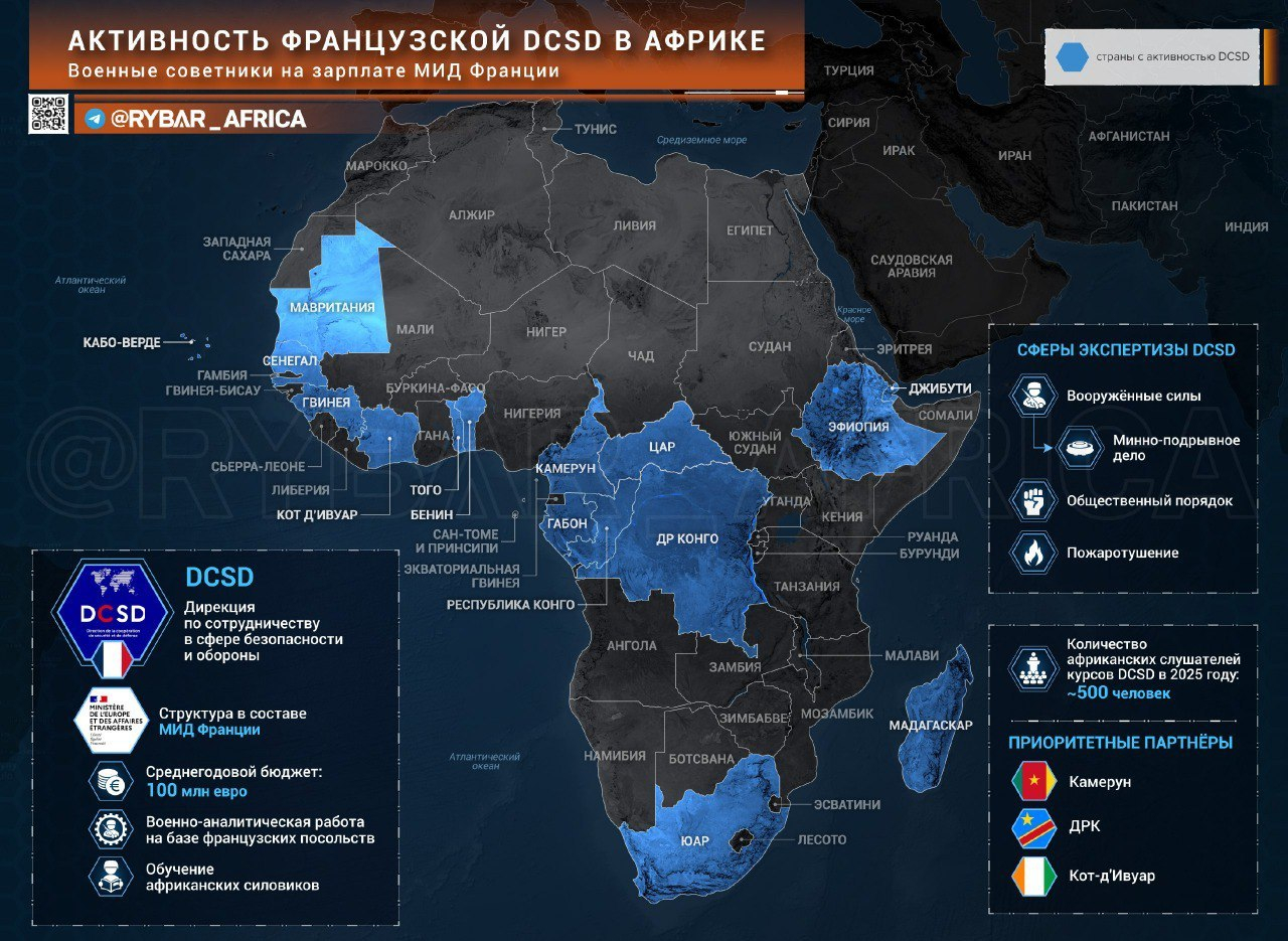 Au-delà d'une présence militaire - qui s'est nettement réduite sous l'ère Macron - la France maintient un pied en Afrique en matière de sécurité, a souligné dans un post publié le 21 février sur sa chaîne Telegram, le média russe Rybar. Ce dernier s'est penché sur les missions menées par la "discrète" direction de la Coopération de sécurité et de défense (DCSD), rattachée au Quai d'Orsay, et dont "l'influence sur les pays africains est loin d'être négligeable".