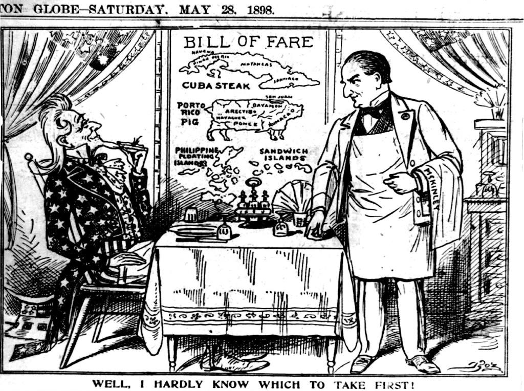 Une caricature de l'Oncle Sam assis dans un restaurant, regardant le menu où figurent "steak de Cuba", "cochon de Porto Rico", "îles Philippines" et "îles Sandwich" (Hawaï), et disant au serveur, le président William McKinley : "Eh bien, je ne sais pas lequel choisir en premier !" (Extrait du Boston Globe du 28 mai 1898/Domaine public)
