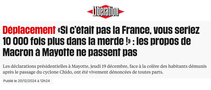 Dans le cas de Mayotte, ce contrôle se manifeste de plusieurs façons. Les médias francophones dominants traitent la question mahoraise presque exclusivement sous l'angle de l'immigration irrégulière, de l'insécurité ou de la pression démographique, jamais sous l'angle du droit international violé ou de la légitimité comorienne sur l'archipel. La position des Comores, pourtant soutenue par une résolution de l'ONU adoptée à 102 voix contre 1, est pratiquement absente du paysage médiatique français.