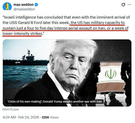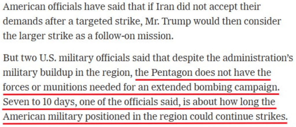 "Malgré le renforcement militaire américain près de l'Iran, deux responsables militaires américains ont déclaré que le Pentagone ne disposait pas des forces et des munitions nécessaires à une campagne de bombardements prolongée. L'un d'eux a estimé que les forces américaines actuellement déployées dans la région ne pourraient mener des frappes que pendant 7 à 10 jours, ce qui limite la faisabilité d'une opération militaire de longue durée". source : NYT