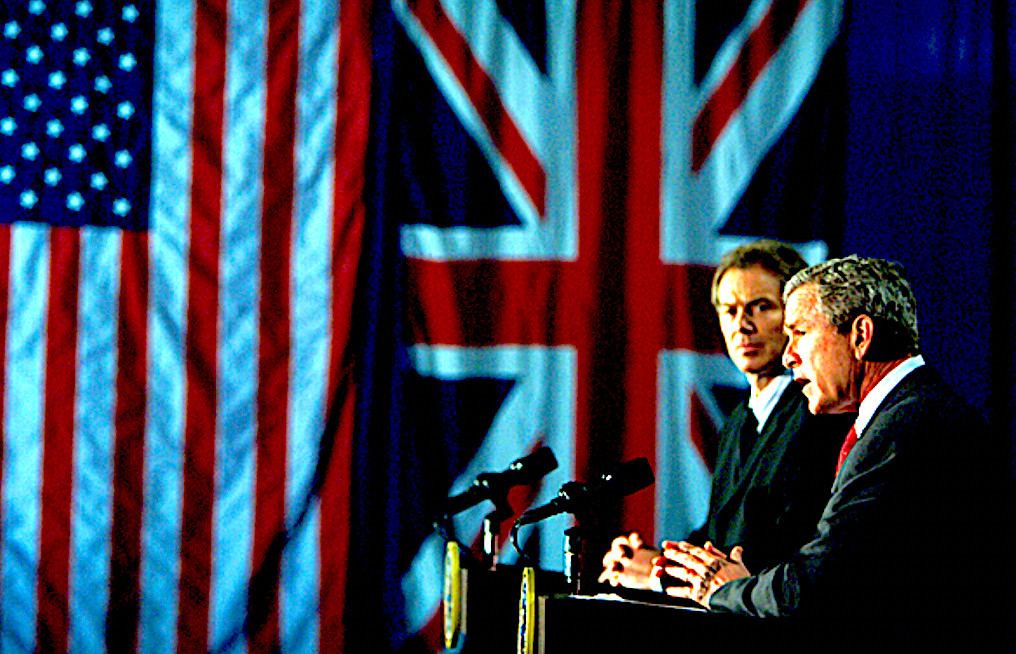 Feb. 5, 2002: U.S.President George W. Bush, right, and U.K. Prime Minister Tony Blair trying to sell the invasion of Iraq at a joint news conference at Prairie Chap in Crawford, Texas. (The U.S. National Archives)
