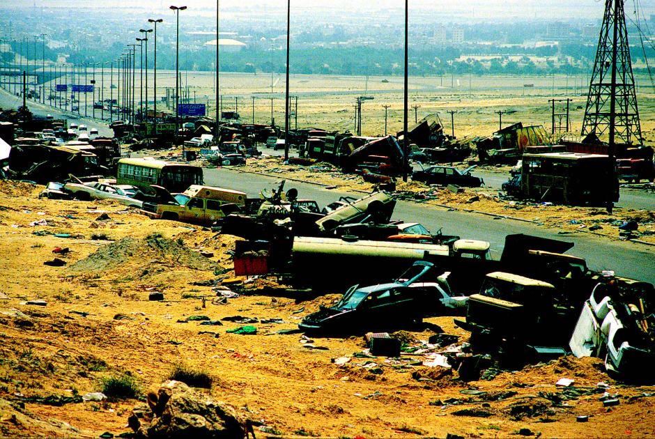 April 18,1991: Demolished vehicles line Highway 80, also known as the "Highway of Death", the route fleeing Iraqi forces took as they retreated fom Kuwait during Operation Desert Storm. (Joe Coleman,/Air Force Magazine,/Wikimedia Commons)