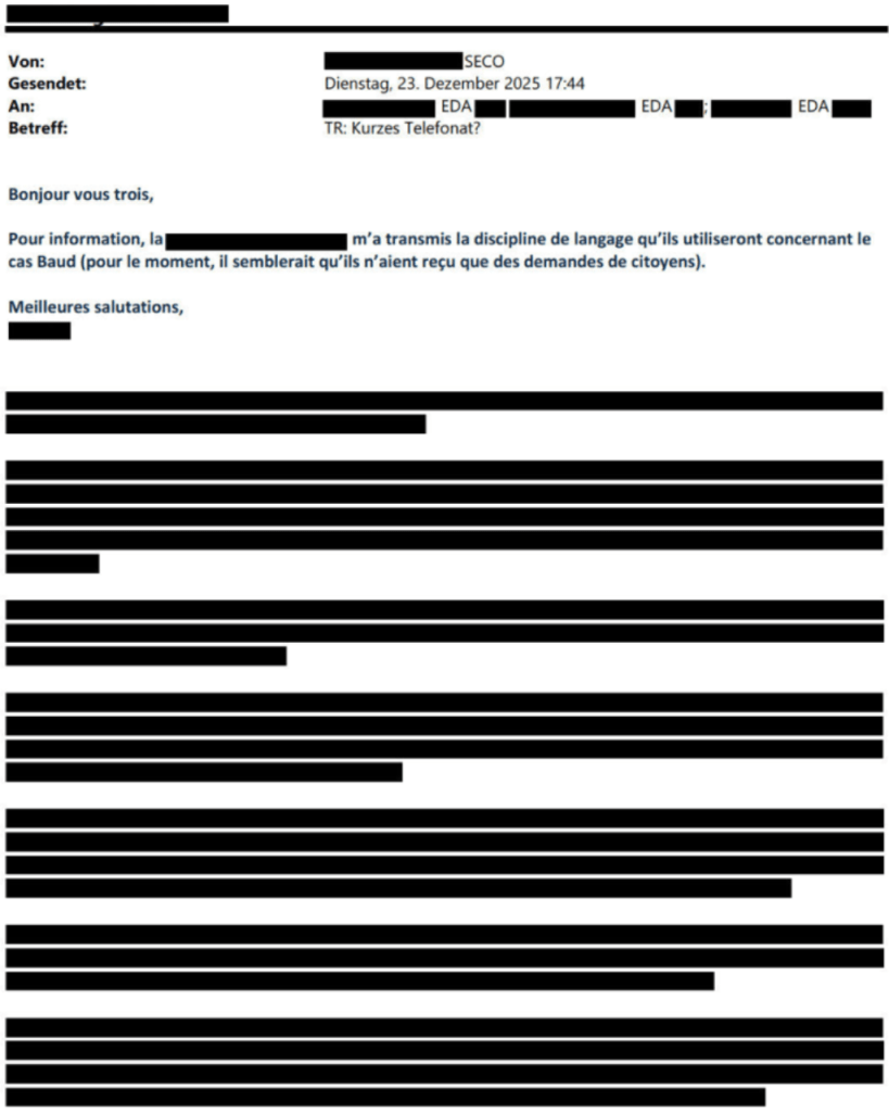 Le Secrétariat d'État à l'économie SECO a formellement accédé à cette demande le 28 janvier 2026. Pourquoi formellement ? - La plupart des textes des courriels ont été caviardés.