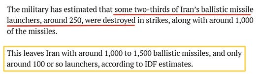 Il convient de préciser que le terme "lanceurs" désigne les plateformes de camions porte-missiles, et non les missiles eux-mêmes. L'Iran possède peut-être des milliers de missiles, et Israël se vante d'avoir détruit les lanceurs, qui ne sont en réalité que des camions facilement réparables ; sans compter que l'Iran disposerait de nombreux missiles capables d'être tirés directement depuis le sol, sans véhicule lanceur.