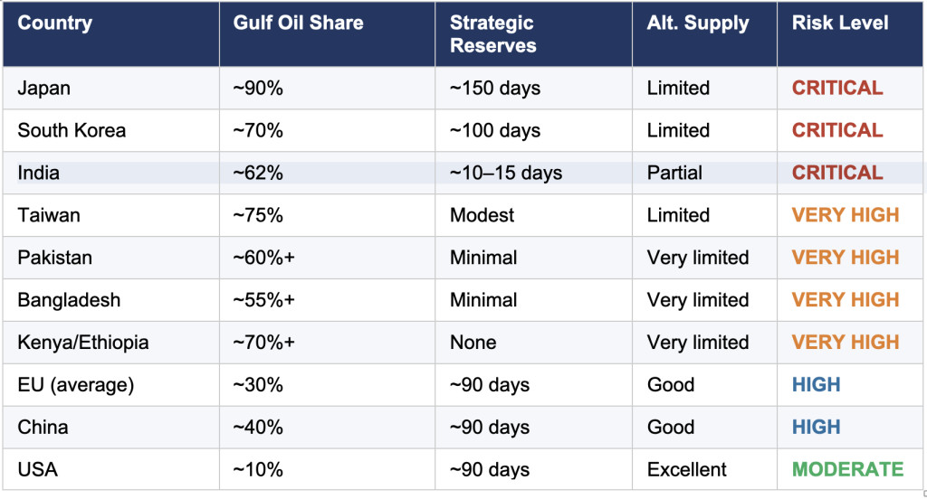 Not all nations face equal exposure. Several are significantly better positioned to withstand a Gulf shutdown, either because they produce their own energy, have diversified supply, or hold large strategic reserves.