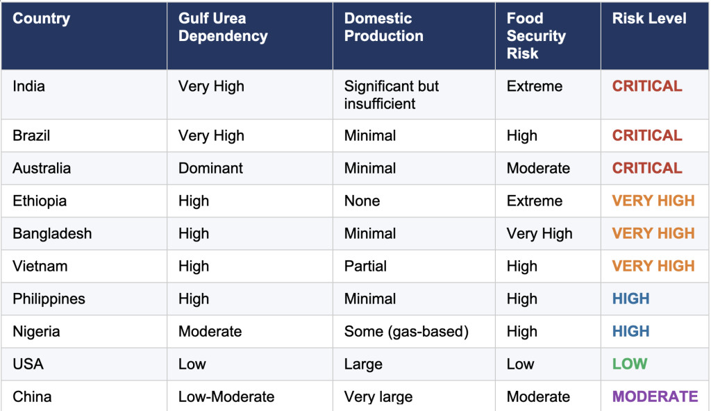 Brazil is among the world's top urea importers, having dramatically expanded its agricultural output - it is now the world's largest soy and beef exporter, and a major corn and sugar producer. Brazil produces almost no urea domestically at scale and imports a very large share from Gulf producers, particularly from the UAE and Qatar. A urea supply disruption would threaten Brazilian agricultural yields across the Cerrado and Amazon frontier regions, affecting both domestic food supply and Brazil's critical role as a global food exporter. The consequences would ripple through global commodity markets.
