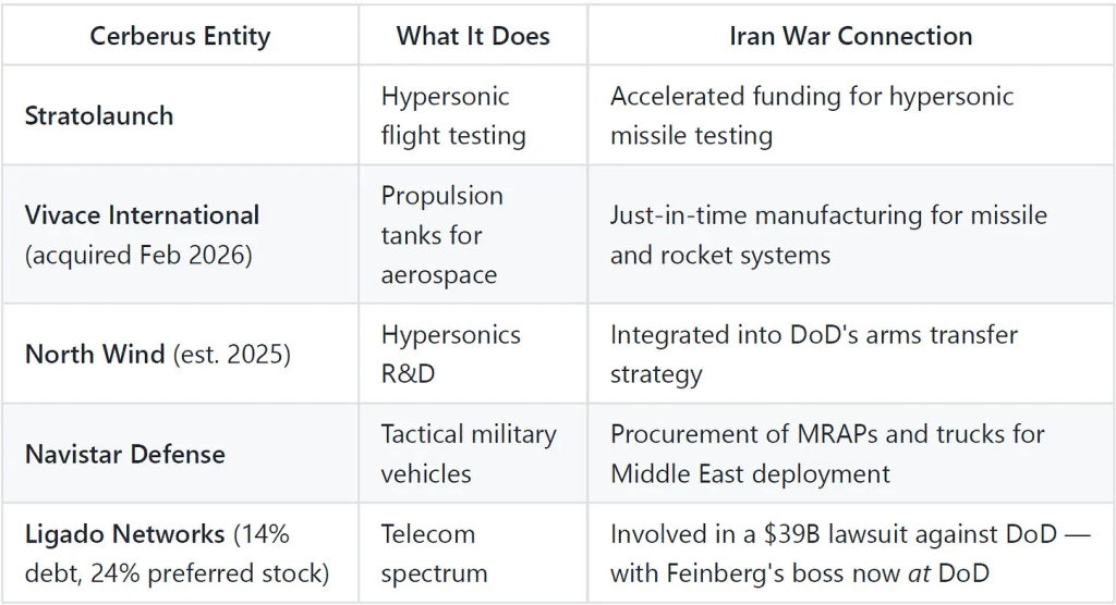 Feinberg a signé un accord d'éthique pour céder ses participations dans Cerberus. Puis il ne l'a pas fait. Il a maintenu des liens financiers avec la société par le biais de contrats de services administratifs pour la comptabilité et la conformité fiscale - contrats qu'il a prétendu être "impossibles" à transférer à un prestataire externe. C'est une "impossibilité" bien pratique lorsque le portefeuille de votre "ancienne" société est un bénéficiaire direct de la guerre que vous contribuez à mener.