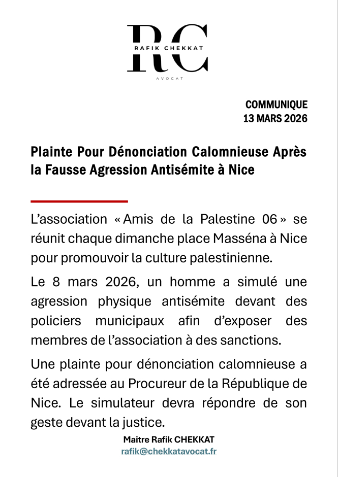 Le provocateur qui avait simulé une agression lors d'un rassemblement de soutien au peuple palestinien, devra répondre de son acte devant la justice : une plainte pour dénonciation calomnieuse vient ainsi d'être déposée, annonce l'avocat Rafik Chekkat.