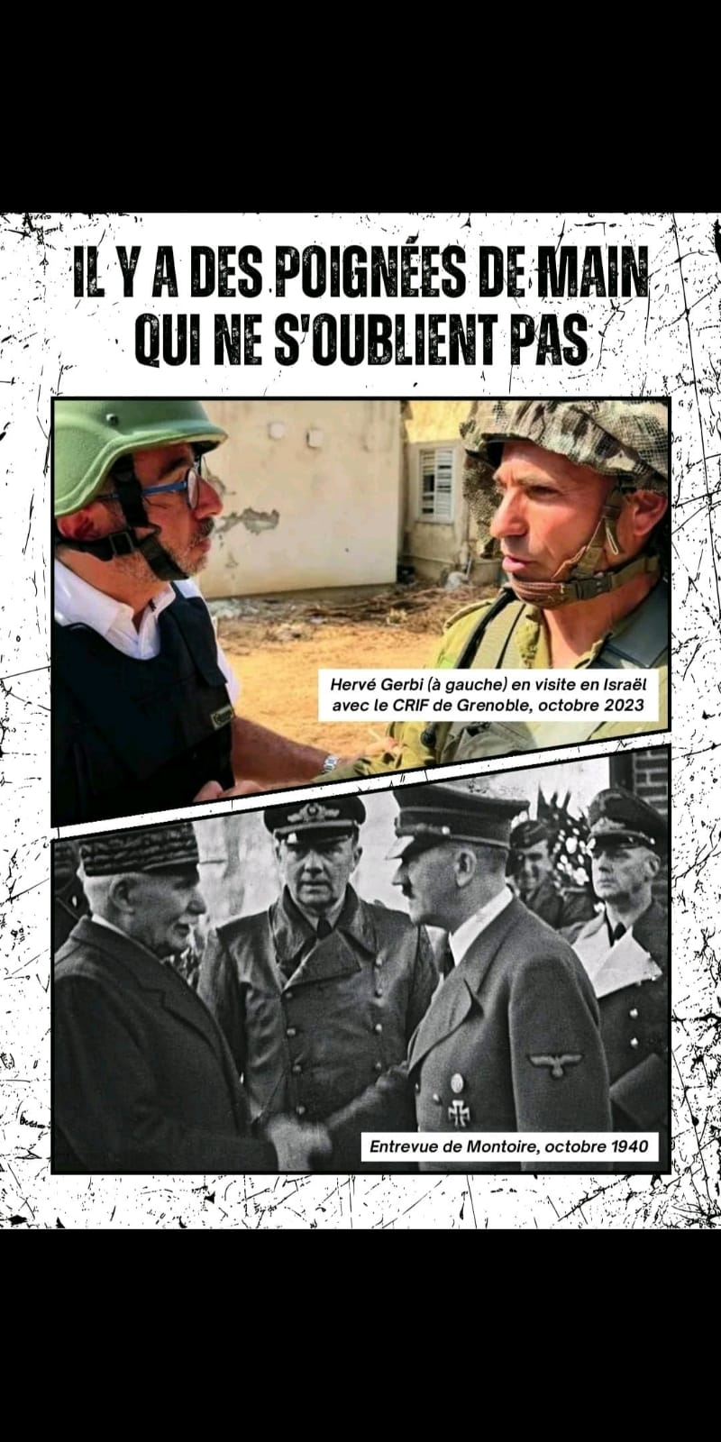 Militant et enseignant, il venait de remporter une belle victoire après avoir collé dans Grenoble un montage photographique montrant, d'une part, le politicien et ancien responsable local du CRIF, Gerbi serrant la main d'un officier de l'armée génocidaire israélienne en octobre 2023, et d'autre part la tristement célèbre rencontre entre Pétain et Hitler en 1940.