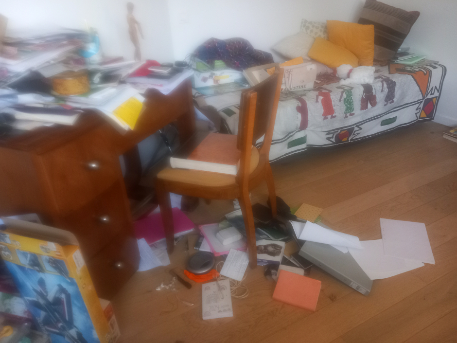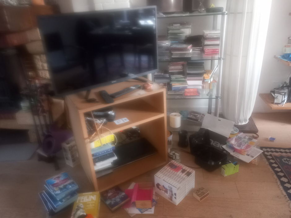 Grands coups frappés à 6 H du matin jusqu'à ce que l'on comprenne que c'était la police. Huit personnes cagoulées entrent chez nous à l'Ile Saint-Denis et immobilisent Nicolas Shahshahani, m'interdisant de m'approcher de lui. Puis se mettent à fouiller la maison mettant nos affaires sens dessus dessous.
