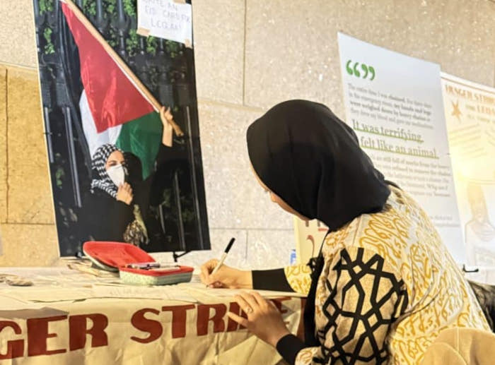 Mahmoud Khalil, le premier manifestant de Columbia à avoir été interpellé, s'est rendu sur place pour soutenir à la fois la 45e semaine consécutive de veillée et le lancement de la grève de la faim, comme l'a rapporté le journal du campus, The Columbia Inspector.