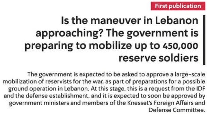 Entre-temps, pressentant la fin imminente de son histoire nationale - et sa soif de sang toujours insatiable -, Israël veut jouer le tout pour le tout en annonçant une nouvelle invasion pour s'emparer du le Liban jusqu'au fleuve Litani ; oui, une énième tentative. Pour ce faire, la colonie génocidaire envisagerait une mobilisation massive.