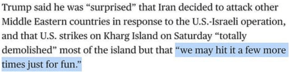 L'absence totale de but de cette opération ratée est illustrée par la nouvelle déclaration de Trump lors d'une interview sur NBC. Après avoir affirmé que l'île de Kharg avait été "totalement détruite" - malgré les informations vérifiées par les médias traditionnels montrant que l'Iran continuait d'y livrer du pétrole comme d'habitude -, Trump déclare avec désinvolture qu'il pourrait frapper l'île à nouveau "juste pour le plaisir".