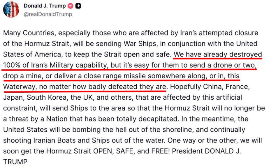 Comme le souligne le commandant de la marine iranienne, Trump supplie désormais ses alliés de débloquer le détroit, les accusant d'en être responsables alors que, Trump prétend que les États-Unis ont miraculeusement "décimé" tout l'Iran.