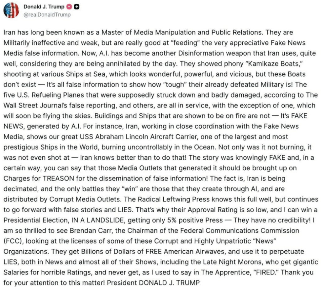 De façon absurde, il prétend que c'est l'Iran qui utilise de faux documents alors que c'est la Maison-Blanche qui diffuse en continu des vidéos de propagande générées par l'IA, sans parler du patron de Trump qui arbore six, voire sept doigts dans ses dernières opérations de relations publiques.