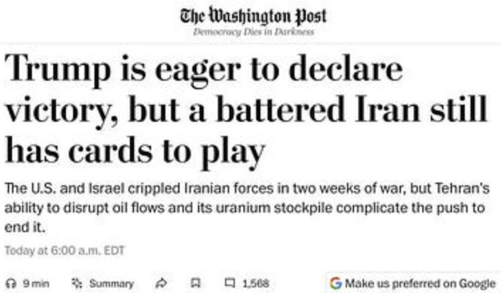 Trump se trouve face à un dilemme périlleux qu'il a lui-même provoqué : s'il recule maintenant, la "guerre" sera perçue comme une victoire morale majeure pour l'Iran, ce dernier ayant réussi à dissuader les États-Unis d'atteindre leurs principaux objectifs malgré une campagne de bombardements massive et incessante. Mais s'il persiste dans son acharnement, il s'expose à une catastrophe encore plus grave, car les États-Unis pourraient se retrouver totalement vulnérables militairement, ou risquer de perdre des navires, voire des groupes aéronavals, par simple caprice de Trump. Au moins, s'il reculait maintenant, il pourrait revendiquer une victoire semi-plausible, malgré l'opinion générale selon laquelle l'Iran l'a emporté ; cela suffirait au moins à apaiser une population américaine apathique et désemparée.
