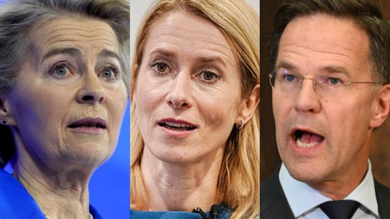 Montage représentant, de gauche à droite, la présidente de la Commission européenne Ursula von der Leyen, le chef de la diplomatie européenne Kaja Kallas et le secrétaire général de l'OTAN Mark Rutte. [Photo d'illustration]
