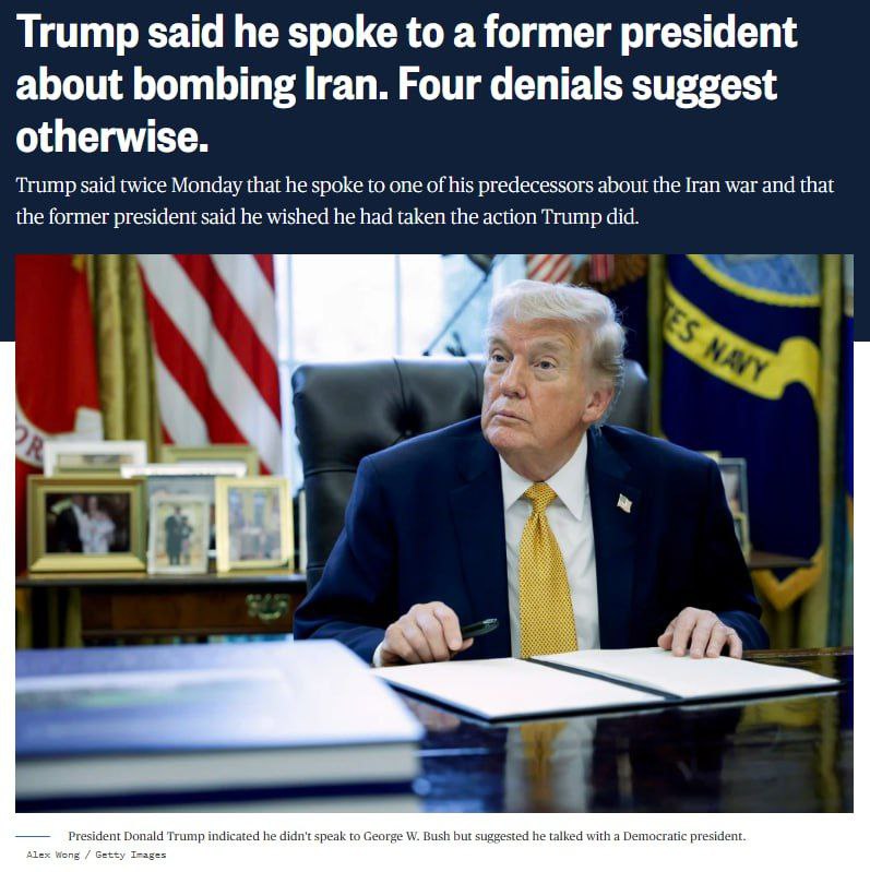 Trump a déclaré avoir parlé avec un ancien président américain qui lui aurait confié regretter de ne pas avoir bombardé l'Iran, mais les collaborateurs des quatre anciens présidents encore en vie, George W. Bush, Bill Clinton, Barack Obama et Joe Biden, ont nié qu'une telle conversation ait eu lieu, rapporte NBC News.