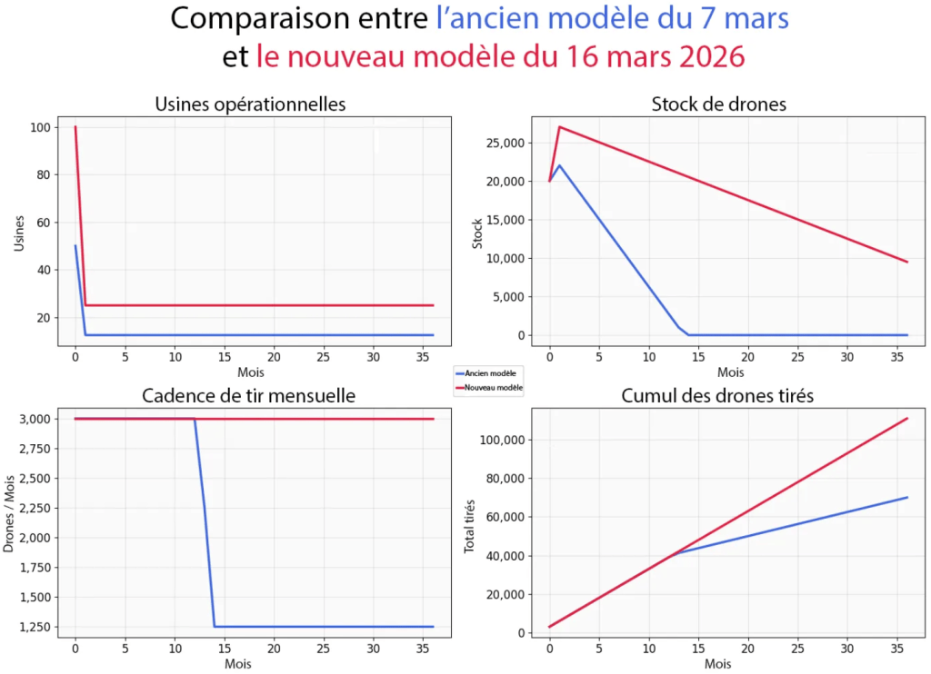 Avec l'ancien modèle présenté le 7 mars (5000/mois), l'Iran pouvait tirer 100 drones par jour pendant un an. Avec le nouveau (10 000/mois), il peut soutenir ce rythme pendant plus de trois ans.
