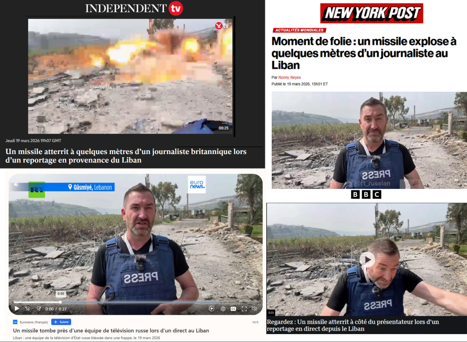 "Des images diffusées jeudi 19 mars par la chaîne publique russe RT montrent Steve Sweeney, son chef du bureau au Liban, courant se mettre à l'abri alors qu'une explosion se produisait derrière lui", a ajouté The Independent, omettant lui aussi de mentionner qu'Israël été à l'origine de la frappe.