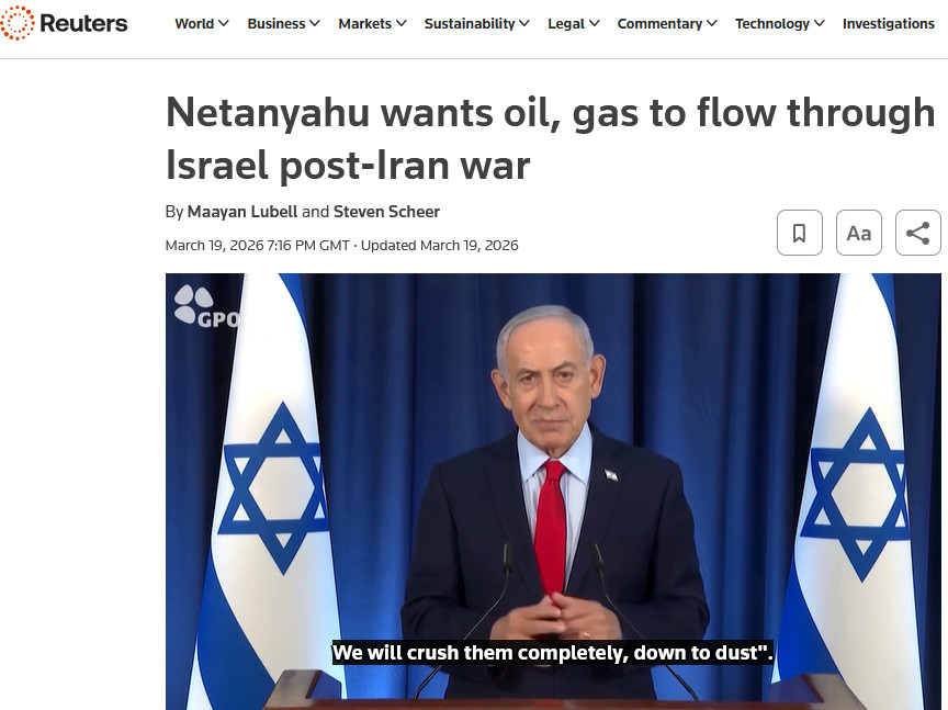 Netanyahu yesterday revealed an interesting part of the endgame - construction of an oil pipeline that brings Iran's oil out to be shipped from a Mediterranean terminal in Israel. That is a breathtakingly audacious plan, but absolutely aligns with Netanyahu's and Trump's actions.