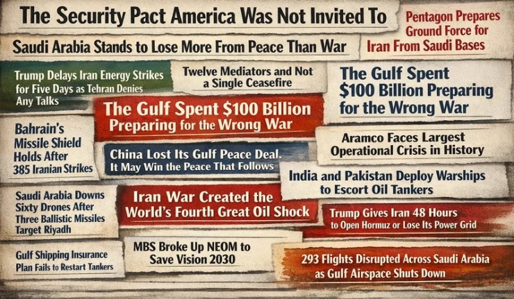 Ce pacte de sécurité apparaît à côté de Le Pentagone prépare une force terrestre contre l'Iran depuis des bases saoudiennes ( Pentagon Prepares Ground Force for Iran From Saudi Bases). Le même jour figurent aussi Le Pakistan a signé un pacte pour défendre l'Arabie saoudite. L'Iran a relevé le bluff ( Pakistan Signed a Pact to Defend Saudi Arabia. Iran Called the Bluff) et L'Arabie saoudite ouvre la base aérienne King Fahd aux forces américaines alors que la guerre contre l'Iran se déplace vers l'ouest ( Saudi Arabia Opens King Fahd Air Base to US Forces as Iran War Shifts West). Le message est double : Riyad ne peut pas se passer des USA dans la guerre présente, mais il ne veut plus dépendre d'eux dans la suivante.