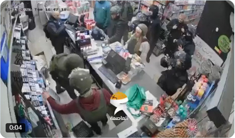 Janvier 2026.- Des colons portant des uniformes de l'armée israélienne filmés en train de voler dans un magasin palestinien du camp de Shuafat, au nord de Jérusalem occupée. (Source VIDEO Ramy Abdu)