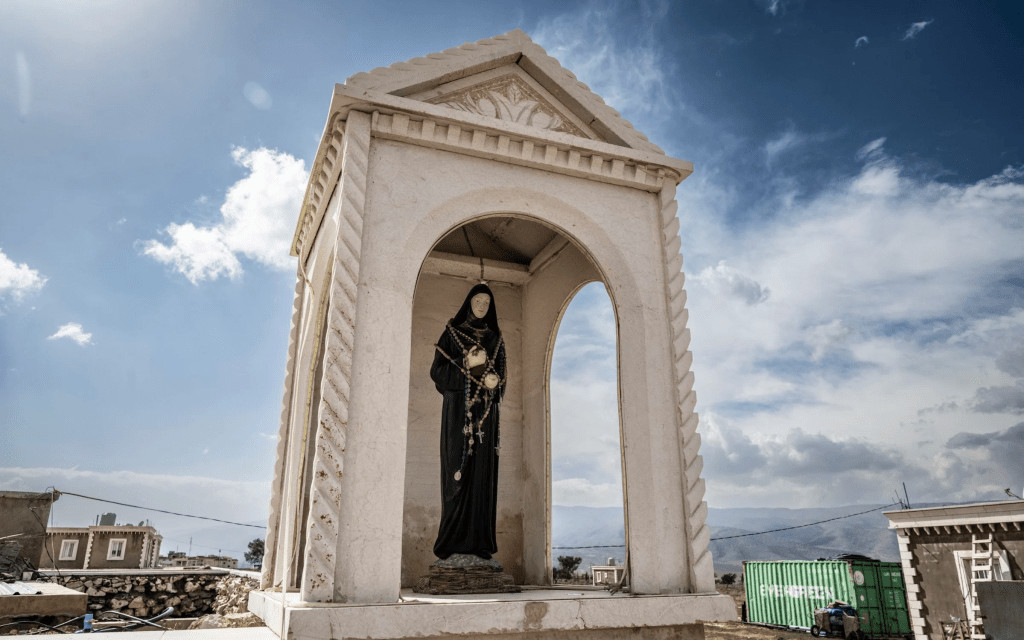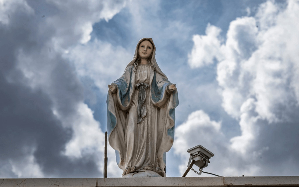 Une statue de la Sainte Vierge trône sur une maison à Ras Baalbek