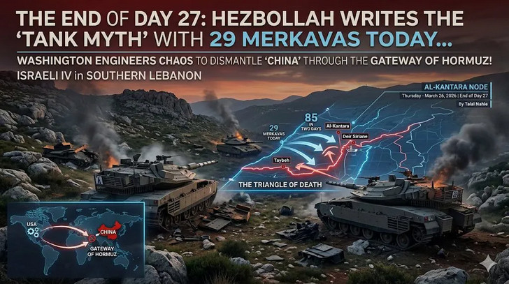 The End of Day 27: Hezbollah Writes the "Tank Myth" with 29 Merkavas Today... and Washington Engineers Chaos to Dismantle "China" through the Gateway of Hormuz! — Talal Nahle