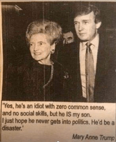 Ci-contre : "Oui, c'est un idiot totalement dénué de bon sens et sans aucune aptitude sociale, mais c'est mon fils. J'espère seulement qu'il ne se lancera jamais dans la politique. Ce serait un désastre". - Authentique ou pas, cela s'est pleinement vérifié depuis début 2025...