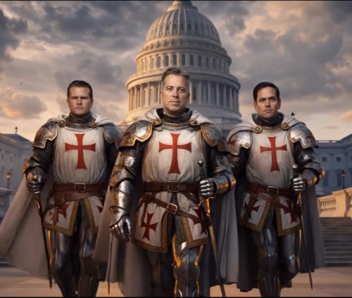 Une mer de versets bibliques et de kitsch évangélique inonde actuellement les réseaux sociaux américains. "Le Seigneur ordonne à ses anges de veiller sur eux dans toutes leurs voies", lit-on dans une publication Instagram accompagnée d'une image montrant des soldats en prière, avec la bannière étoilée, des chars et des avions, survolés par une escouade de chevaliers blancs ailés. Andy Ogles, député républicain à la Chambre des représentants du Tennessee, a publié une vidéo générée par IA où il apparaît avec le ministre de la guerre Pete Hegseth et le ministre des affaires étrangères Marco Rubio, tous trois en armures de croisés devant la Maison-Blanche, avec ces mots: "C'est une bataille entre le bien et le mal".