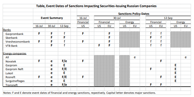 En la tabla: Fechas de las sanciones que afectan a las empresas rusas emisoras de valores, F y E indican las fechas de las sanciones financieras y energéticas, respectivamente. La letra mayúscula indica las sanciones más importantes.