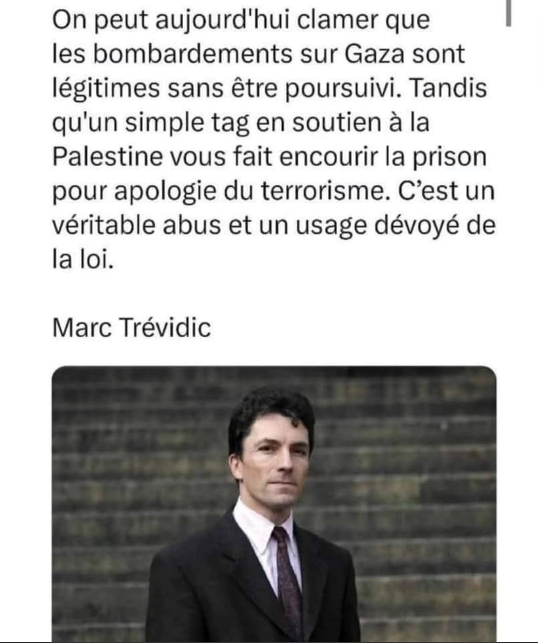 Avec les mêmes articles du 7 et 8 Octobre, si Olivia Zémor avait ajouté qu'il n y a pas de génocide à Gaza elle n'aurait même pas été poursuivie. Elle aurait même été invitée sur les plateaux télé pour exprimer son point de vue.