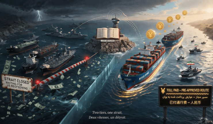 La route maritime la plus importante du monde fonctionne désormais selon un système à deux vitesses. Si vous êtes chinois, russe, indien, pakistanais ou malaisien, vous soumettez vos documents à un intermédiaire lié au CGRI, vous payez entre 0,50 et 1,20 dollar par baril de cargaison via des comptes à la Kunlun Bank - l'institution chinoise qui traite depuis des années les transactions contournant les sanctions contre l'Iran -, vous recevez un code d'autorisation, des instructions d'acheminement et un bateau-pilote qui vous escorte au large de l'île de Larak. Si vous êtes usaméricain, britannique, européen ou allié de l'un de ces pays, vous n'obtenez rien. Vos pétroliers restent à l'ancre avec 2000 autres navires et 20 000 marins bloqués, en attendant que l'Iran rouvre le détroit - ce qu'il n'a pas l'intention de faire selon les anciennes règles.