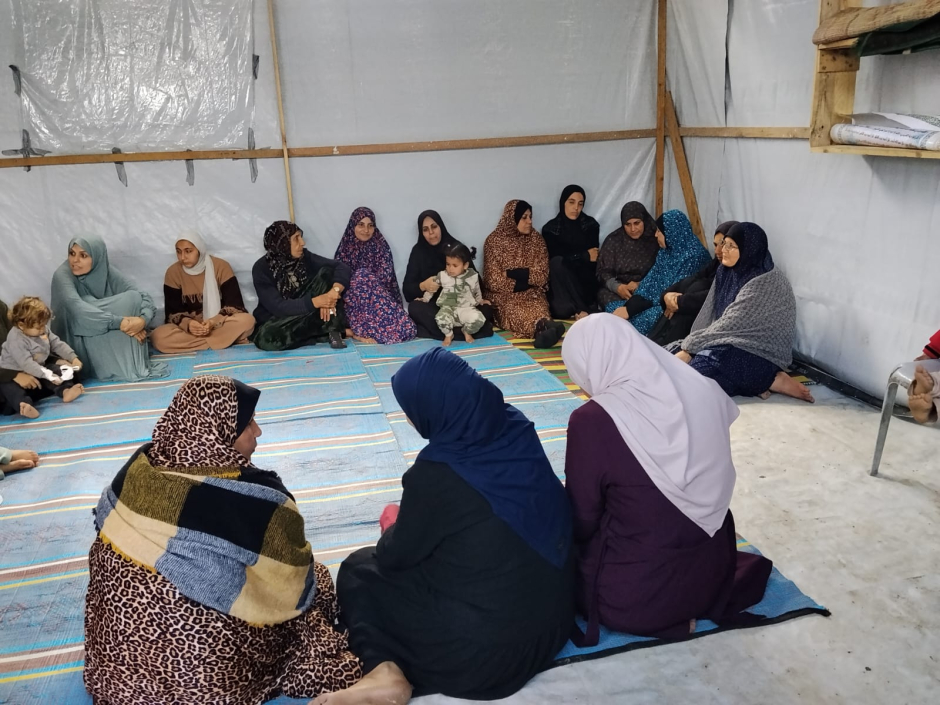 Dans ce cadre a été organisée la séance : Ensemble, nous surmontons les difficulté, le réseau de sécurité, mise en œuvre par l'équipe UJFP dans le camp d'Al-Israa, à l'ouest de Gaza, avec la participation de 25 femmes déplacées. Cette rencontre a ouvert un véritable espace de dialogue sur la manière de transformer cette proximité contrainte en source de force plutôt qu'en facteur de pression supplémentaire.