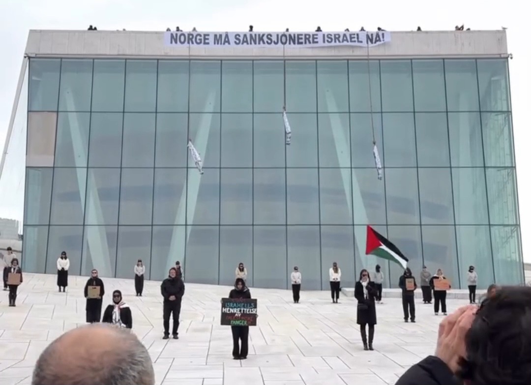 video.europalestine.comDes Norvégiens manifestent leur solidarité avec les prisonniers palestiniens détenus dans les prisons israéliennes devant l'Opéra de Norvège à Oslo.