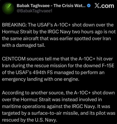"Plusieurs incidents impliquant des aéronefs américains se sont produits dans la zone d'opérations du Commandement central américain (CENTCOM) au cours des dernières 24 heures : 1. Un F-15E "Strike Eagle" de l'US Air Force a été touché par des tirs iraniens et s'est écrasé en Iran. Les deux membres d'équipage ont survécu, l'un d'eux ayant été secouru. Une importante opération de recherche et de sauvetage est en cours pour retrouver le second. 2. Un hélicoptère HH-60W "Jolly Green II" de l'US Air Force, participant à une opération de sauvetage de l'équipage du F-15 abattu, a essuyé des tirs d'armes légères. Au moins un membre d'équipage a été blessé, mais l'appareil a pu regagner sa base. 3. Le pilote d'un A-10C "Thunderbolt II" de l'US Air Force s'est éjecté au-dessus du golfe Persique. L'Iran a revendiqué la destruction de l'appareil. Le pilote a été récupéré sain et sauf. 4. Un F-16C "Fighting Falcon" de l'US Air Force a brièvement été détecté sur les sites de suivi de vol, émettant le code transpondeur 7700 (urgence) au-dessus de l'Irak. 5. Un KC-135 "Stratotanker" de l'US Air Force émettait le code transpondeur 7700 (urgence) au-dessus d'Israël.